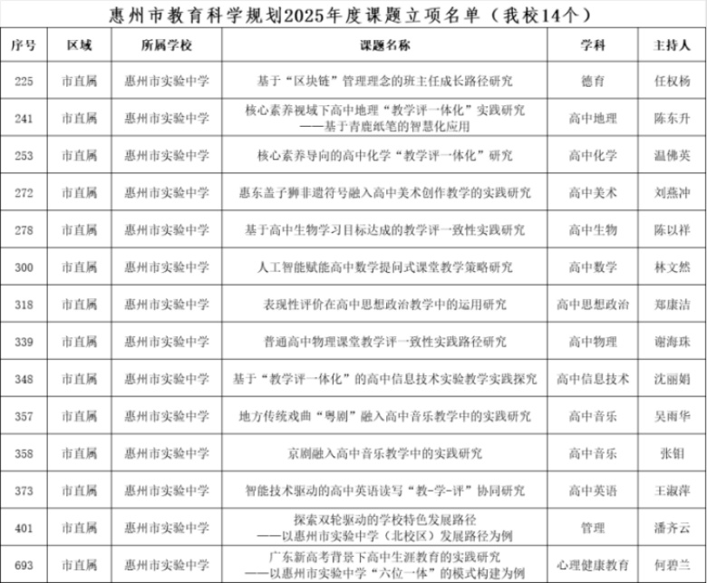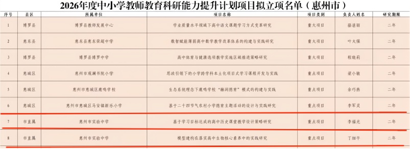 卧龙金秋结硕果,实中“五师”铸辉煌。近日,广东省《2026年度中小学教师教育科研能力提升计划项目拟立项名单》和《惠州市教育科学规划2025年度课题立项名单》公布,我校李福光、丁细平两位老师的省级课题成功立项,任权杨等14位老师的市级课题成功立项。