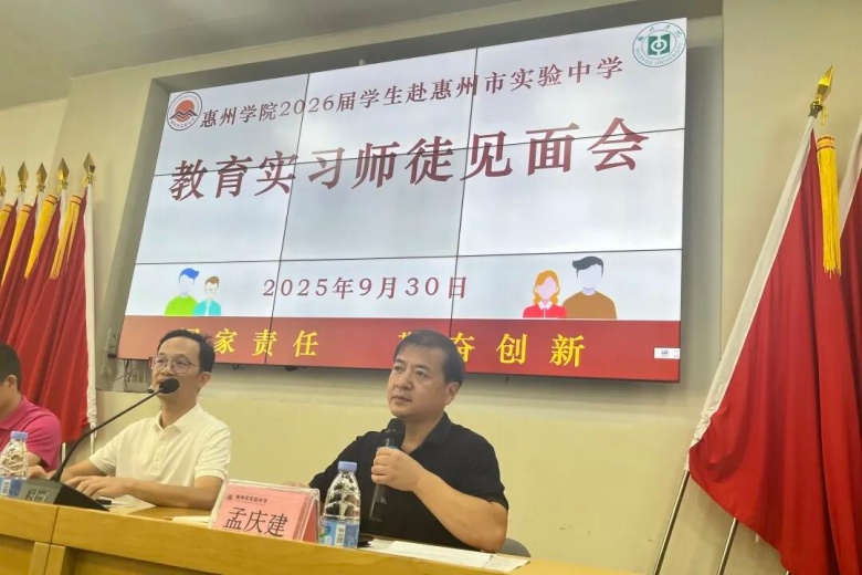 9月30日上午9:30,惠州学院2026届本科生赴实中教育实习师徒见面会在我校召开。我校副校长陈以祥、惠州学院地理与旅游学院副院长吴鹏豹、我校教务处主任孟庆建、副主任刘珊珊、两校实习指导教师代表及惠州学院2026届赴实中开展本科教育实习的全体实习生参加了会议。此次见面会旨在延续两校一直以来的校地协同育人合作,通过集中教育实习落实惠州学院践行师德、学会教学、学会育人、学会发展的师范生培养要求,也为惠州的基础教育教育事业培育新鲜血液,为办人民满意的教育尽我校的一份心力。