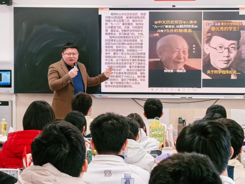 学校党委高度重视,由党支部书记带头,党员发挥先锋模范作用,班主任共同参与,深入班级主讲。班会围绕“回顾‘十四五’发展成就”“展望2035年国家与个人发展图景”“立足当下规划行动路径”三大板块,引导学生思考国家战略与个人成长的内在关联,帮助学生树立将个人理想融入时代发展的责任意识。