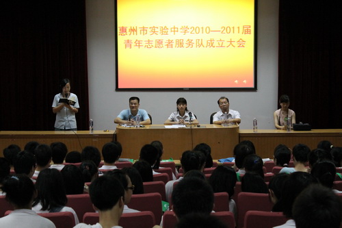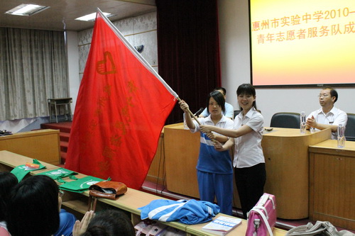受邓凡用校长委托,校长助理罗粤珂出席大会作讲话并为服务队授旗。她充分肯定了我校历届志愿者服务队为惠州经济社会的发展、构建文明和谐校园所作的贡献,代表学校感谢志愿者们的热情工作、无私奉献,并希望新一届志愿者们充分利用志愿者服务队这个平台,在积极参与志愿服务中不断提升自身综合素质,实现自己的人生价值,以实际行动践行“奉献、友爱、互助、进步”的服务精神,继承和发扬我校志愿者服务队的优良传统,为惠州社会的发展,为建设一个更加文明、和谐的实中而贡献力量。
