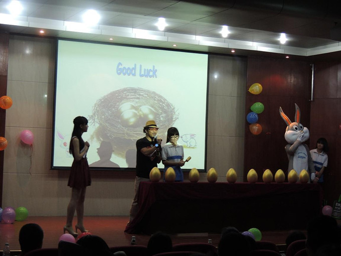 国际部主任首先就举办复活节晚会的意义作了个简短的发言,她指出学生在学习外语的同时要了解相关的文化背景知识,尽管复活节本意是个宗教节日,但我们应该学习这个节日所提倡的利他精神和关爱他人的精神。