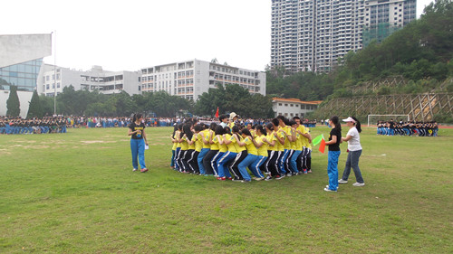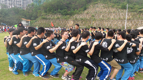 参加活动的学生穿着班服,唱着班歌,还有些班级带上了班旗,抽签按小组计时比赛。全班学生以班主任为圆点围城一个圆圈,全部依次坐在后面同学的大腿上,不能接触地面。“坚持!”“拼了!”……同学们个个涨红了脸,卯足了劲,汗流浃背,两腿都发抖了,但是谁也不愿意先倒下。加油呐喊声,此起彼伏!经过激烈的拼比,决出了6个小组冠军,其中,高三(12)班以11分30秒的时长获得了全场冠军。