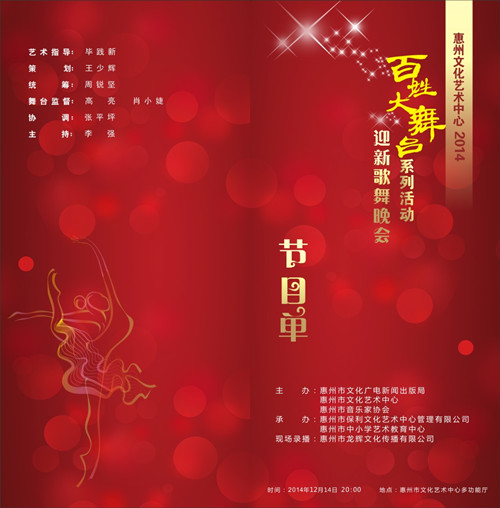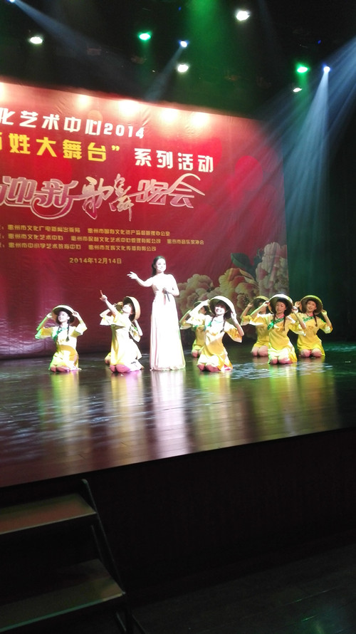 由市文化广电新闻出版局、市国有文化资产监督管理办公室主办、市音乐家协会等承办,市中小学艺术教育中心等协办的“惠州市文化艺术中心2014‘百姓大舞台’迎新歌舞晚会”于12月14日晚八点在市文化艺术中心多功能厅(保利剧院)举行。校长、副书记、副校长等领导嘉宾观看了晚会。