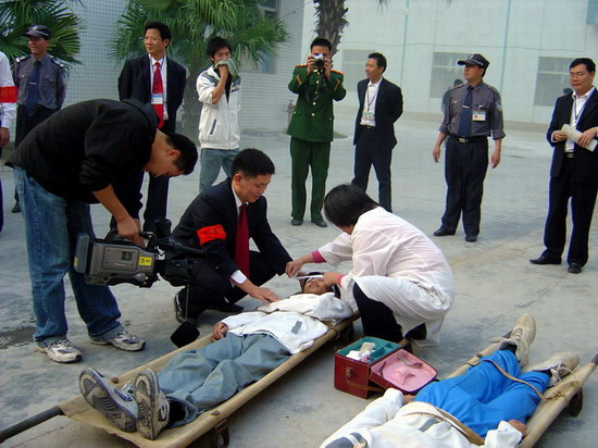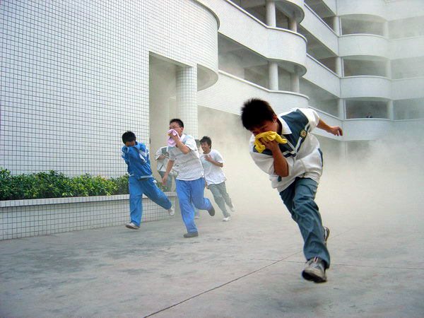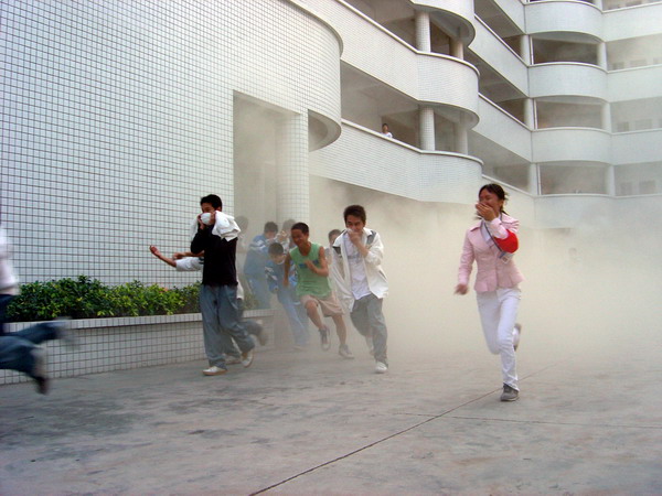 演练开始后,各功能组以最快的速度各就各位,按“消防预案”进行演练。在浓浓的烟雾中,学生们在老师、宿舍管理员的组织下,用湿毛巾捂住口鼻,迅速从各紧急通道疏散出学生宿舍楼。“火势”得到有效的控制。“受伤”学生被用担架抬到安全地带进行救治。整个过程历时6分钟,按计划完成了各项演练任务。