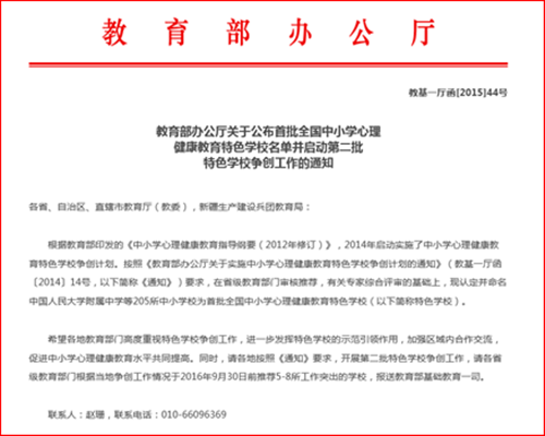 此次获评的首批心理健康教育特色学校心理健康教育工作突出,特色鲜明,成绩瞩目,具有全国示范性。