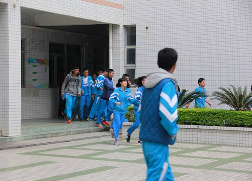 为做好这次安全演练,学校事先制定了周全的演练预案。当听到火警警报后,学生在
