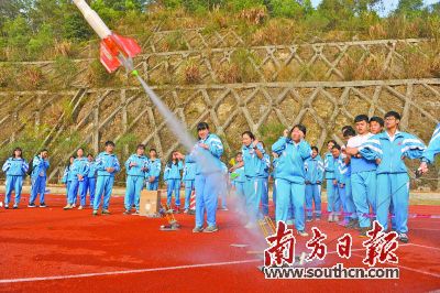 在校园的另一边,学生们围成一圈,仰头注视着天空,时而发出惊呼声。原来,水火箭发射大赛也开始了,火箭的外形各异,飞行姿态也各不相同,一枚枚水火箭“嘭”的一声从发射架上呼啸而起,满载着同学们的创意和梦想,朝着天际飞去。