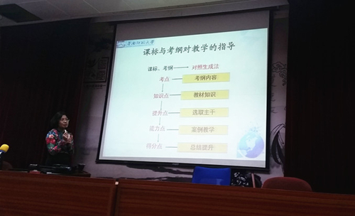 随后,曾玮教授做了《关于地理高考》的专题讲座,曾教授从五个方面对老师们展开了培训:一是如何理解全国卷普通高考的考试性质与改革方向,高考作为选拔性考试,必须具有一定区分度和难度,但系数保持稳定,改革方向将重点考察创新能力方面的内容;二是如何解读地理高考考核目标内容,必须结合背景材料、试题设问、试题分值等方面进行;三是如何分析全国卷地理高考高频考点,主要还是以主干知识为主,不回避热点和重叠考同一区域;四是二轮以后地理高考复习如何备考,认为一轮复习应注重面,打好基础关,二轮复习应建立知识联系,完善能力结构;五是如何训练地理高考答题技巧,应通过专题训练增强学生能力,不断总结方法,反思失误点,修正思维,提高得分能力。