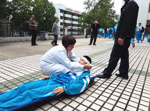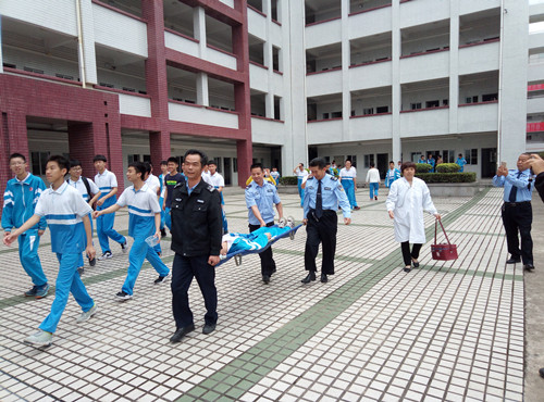 4月24日下午 4点20分,三栋学生宿舍楼的学生仍像往常一样,突然间,“火警信号”响起,整幢宿舍楼学生立即沸腾起来,由相关部门校领导、宿管办、安全办部门负责人指挥,各班班主任、各楼层宿舍管理员立即组织学生按预定方案、指定线路有序撤离。校园安全领导小组组长用话筒扩音系统大声安排负责各个楼道口的班主任老师立即到位,协助疏散学生逃生,按照学校消防疏散路线向学校操场疏散。大家用湿毛巾捂住鼻子涌向楼梯。三栋宿舍共有三条消防逃生楼道。事先安排的各楼道口有关教师里应外合疏散撤离的学生。校安保队员和校医组成医疗救助小组,对从“火场”疏散出来 “不慎受伤”的同学用担架抬到安全区域进行紧急包扎处理。整个过程有条不紊,最快的高二年级仅仅用了1分47秒,2分40秒后整栋宿舍楼的学生已安全疏散到操场。没有出现一个学生留在现场,也没有出现因为拥挤而造成的意外事故发生。