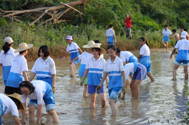 第二日下午基地开展的徒手抓鱼体验活动,应该是每个同学都非常喜欢的实践活动。为了抓到更多的鱼,给今晚的晚餐加料,同学们各显神通,群策群力,充分利用各类工具"挽起袖子加油干"。看着你们渔获满满的幸福,相信同学们最大的收获莫过于彼此之间的信任和协助。劳动创造价值,劳动激发动力!下午同学们继续进行农学体验,翻薯藤、挖番薯,烤番薯,煮番薯糖水,在劳动中感受收获的快乐,体验劳动换来的幸福果实。第二日晚上,我们一起玩游戏,一起欣赏烟花,一起参加篝火晚会,感受快乐时光,相信同学们一定会珍惜这一份岁月静好,一起创造更加美好的生活。